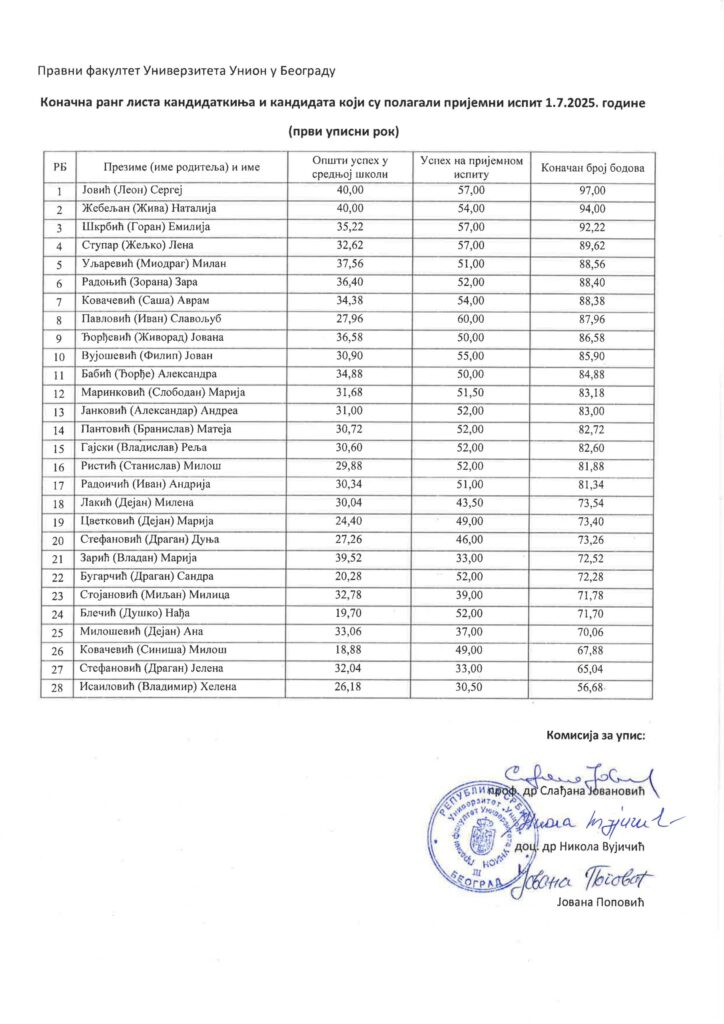 Konačna rang lista prijemnog ispita održanog 1. 7. 2025.