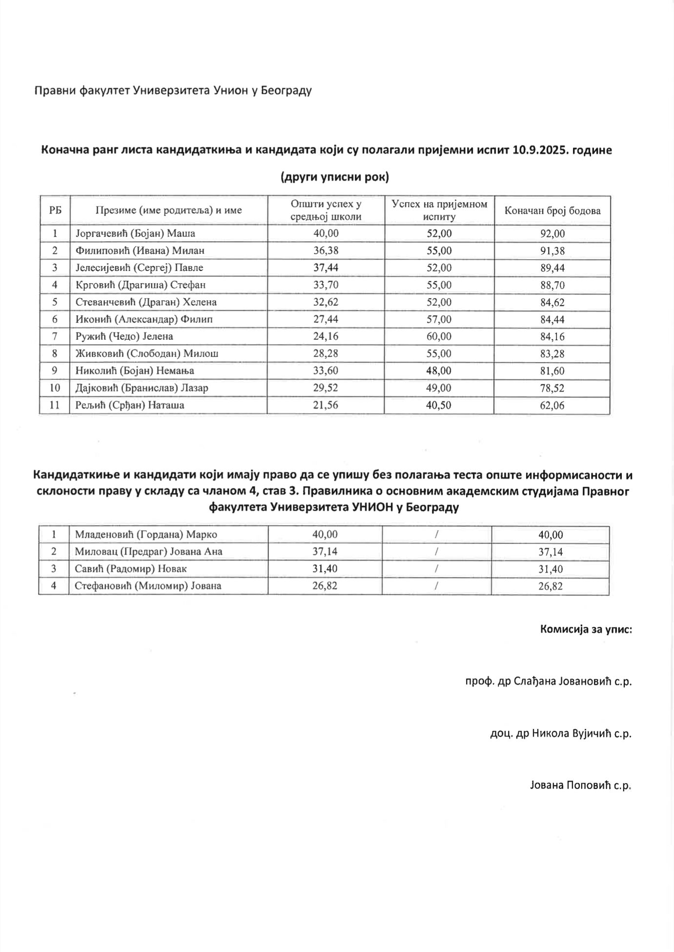 Konačna rang lista prijemnog ispita održanog 10. 9. 2025.