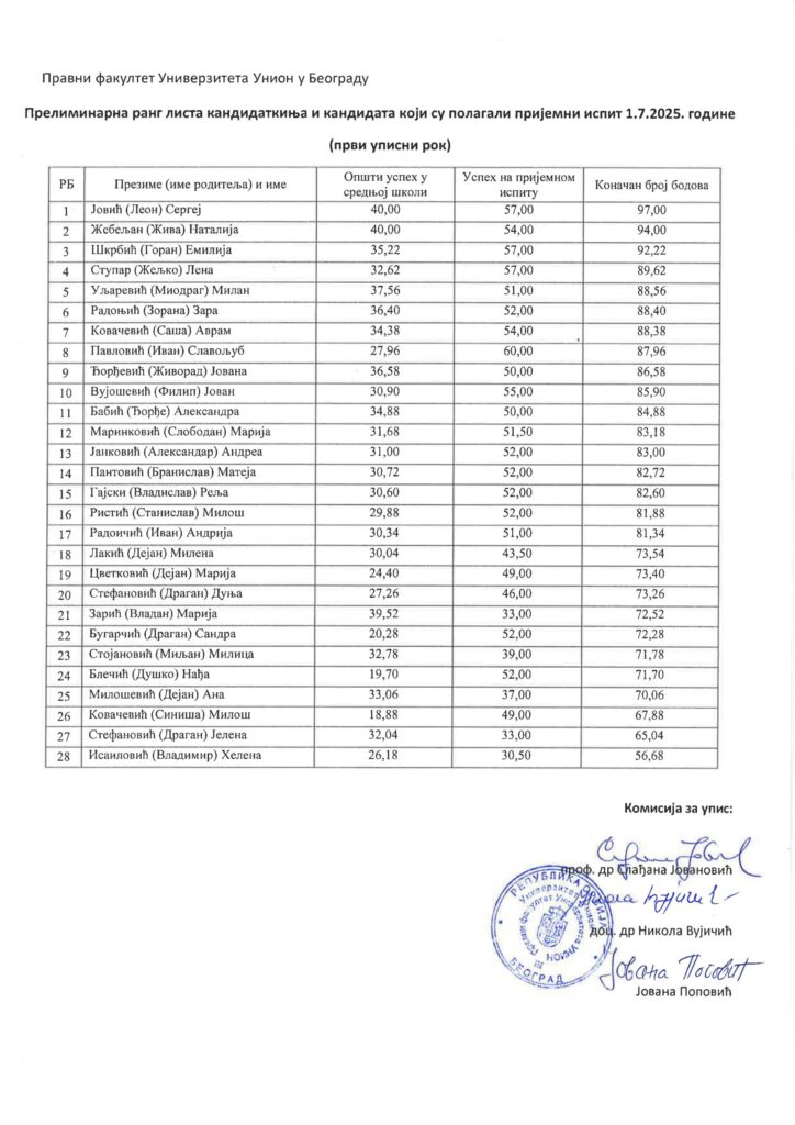 Preliminarna rang lista prijemnog ispita održanog 1. 7. 2025.