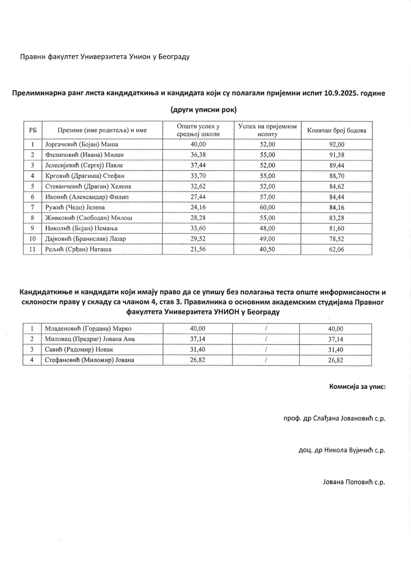 Preliminarna rang lista prijemnog ispita održanog 10. 9. 2025.