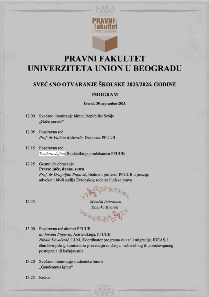 Pozivamo Vas na Svečano otvaranje školske 2025/2026. godine koje će se održati 30. 9. 2025. godine sa početkom u 12:00 časova u Velikoj sali Pravnog fakulteta Univerziteta Union u Beogradu, Bulevar maršala Tolbuhina 36, Novi Beograd.
